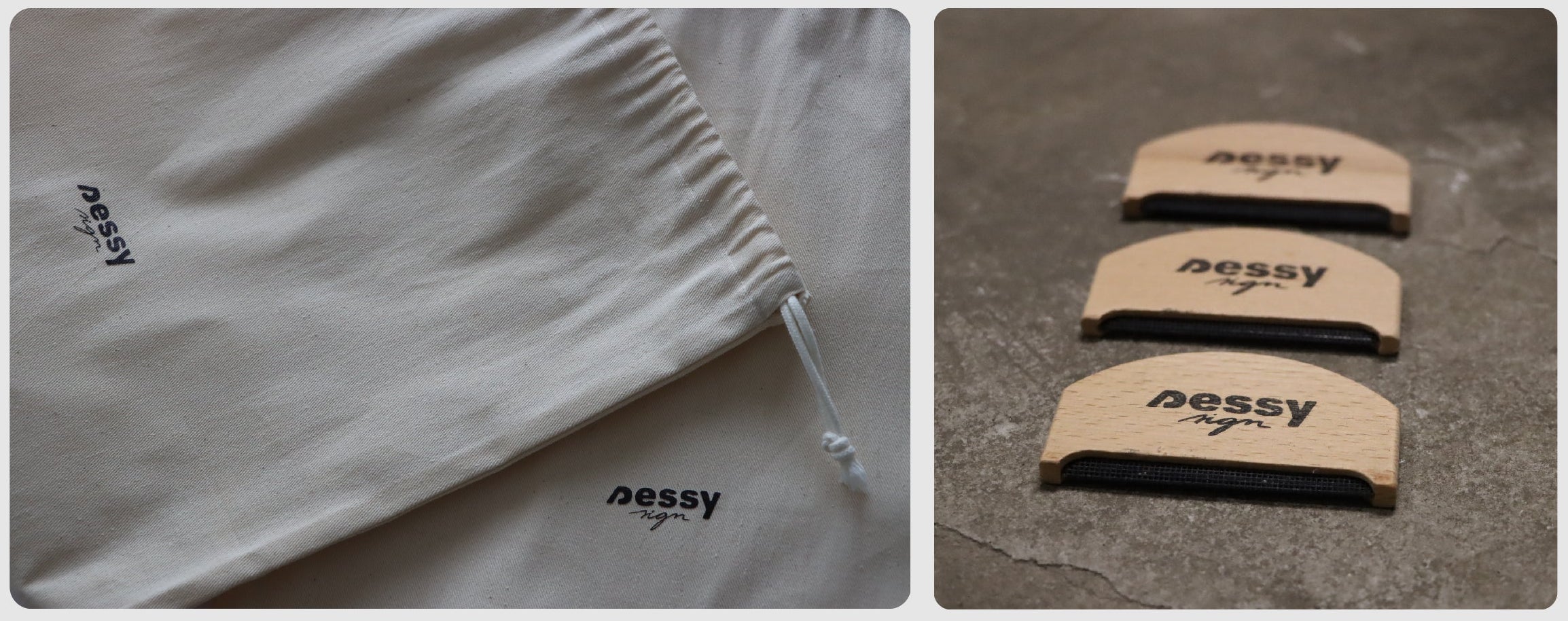Chaque accessoire est accompagné de son outil d’entretien, conçu pour préserver toute la beauté du jersey. Cet outil permet de retirer les légers excès de fibres qui peuvent apparaître avec le temps. Ces petites bouloches ne sont pas un défaut, mais une caractéristique naturelle de la matière.